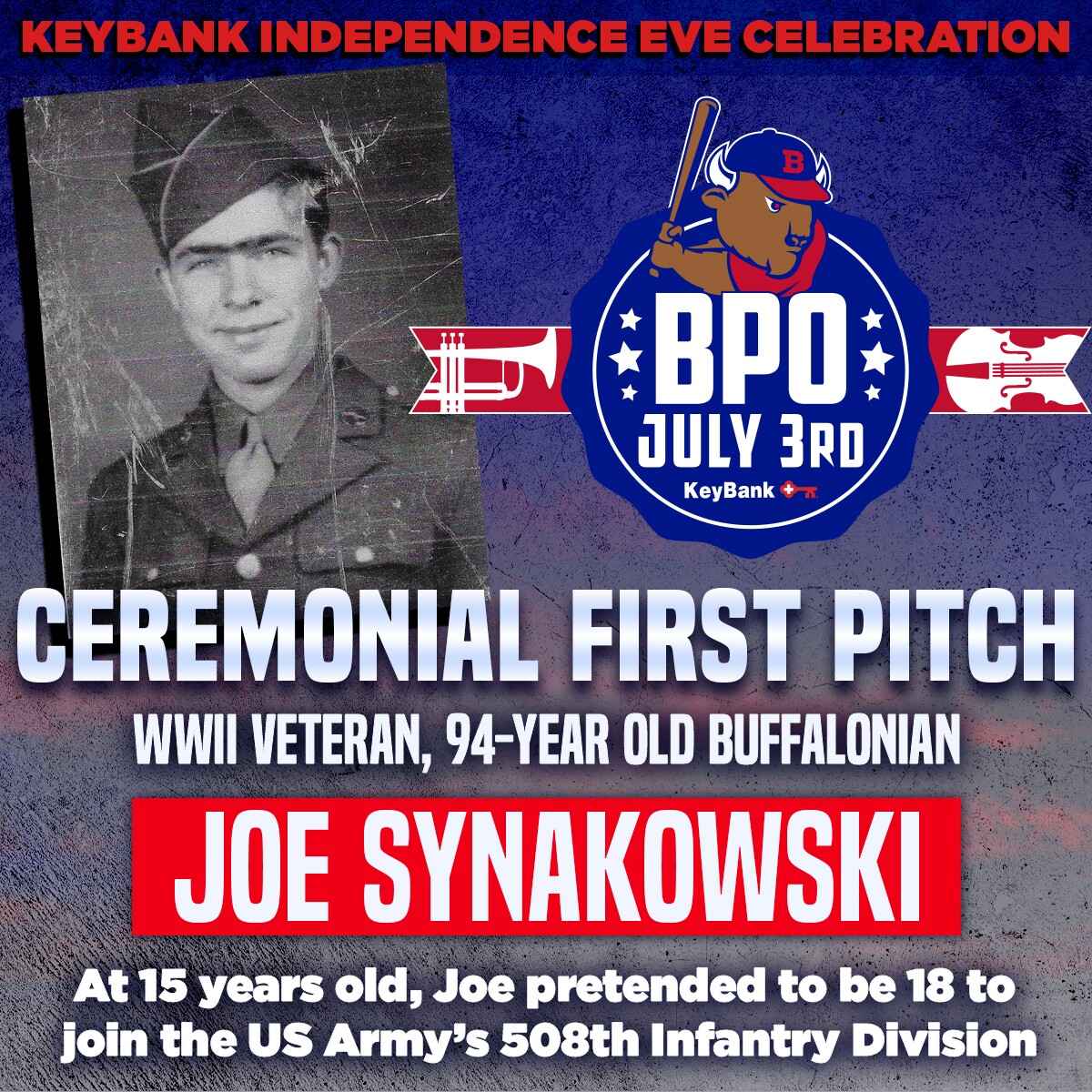BUFFALO, N.Y. (WKBW) — World War II veteran and 94-year old Buffalo-native Joe Synakowski will throw the ceremonial first pitch before the Buffalo Bisons Independence Eve Celebration on July 3.