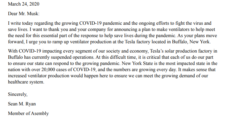 “There is no doubt that COVID-19 has created an unprecedented challenge for New York, for our nation, and for the entire world,” said Assemblyman Sean Ryan. “At this difficult time, it is critical that each of us do our part to ensure our state can respond to the growing pandemic. I thank Elon Musk and the team at Tesla for announcing that they are working on a plan. Tesla’s factory in Buffalo would be an ideal location to ramp up ventilator production, and I urge them to make this commitment immediately."
