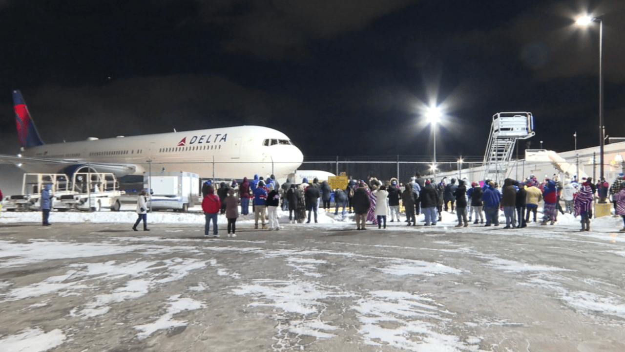 Bills fans cheered on the team as the team landed at the Buffalo Niagara International Airport Sunday night.