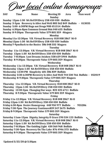Buffalo Area Narcotics Anonymous says it will hold online meetings that are the same format as the normal face-to-face meetings.