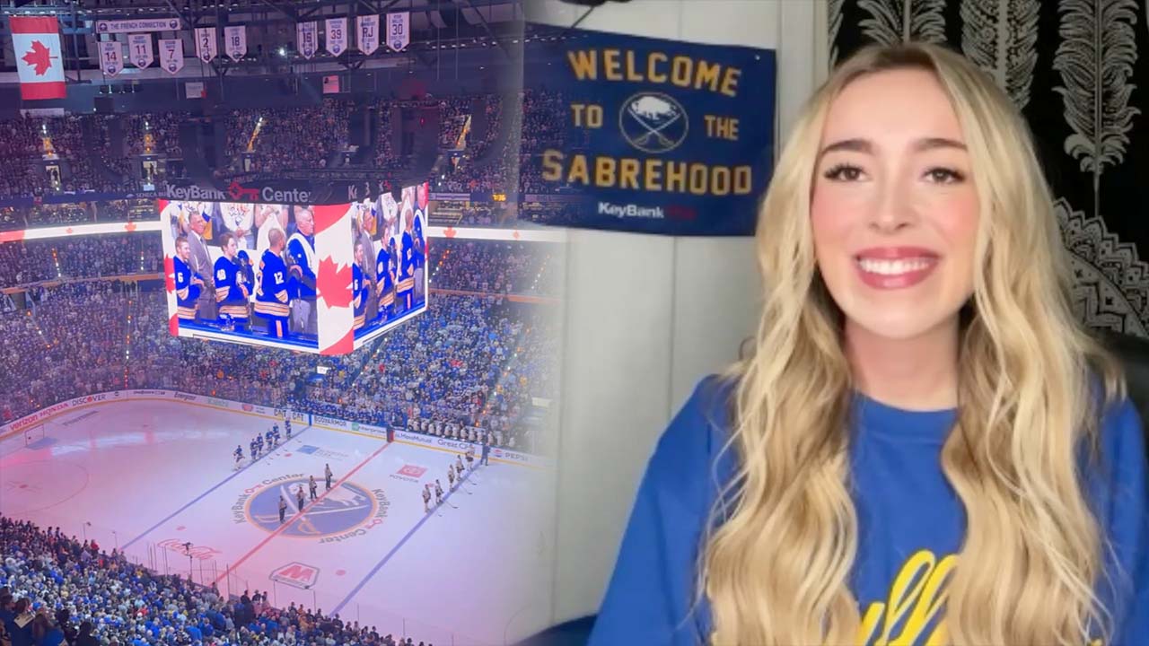 FORT ERIE, ONTARIO (WKBW) — Ahead of Game 5 of the Buffalo Sabres Stanley Cup Playoff matchup against the Boston Bruins, anthem singer Cami Clune's microphone cut out during the Canadian national anthem, but Sabres fans quickly stepped in and belted out "O Canada."