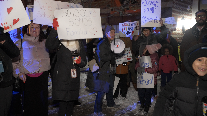 Despite cold weather, dozens of supporters gathered outside the school's campus on Porter and Niagara Street to voice their opposition to the closure.