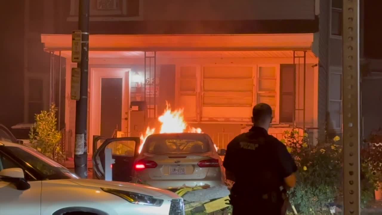 One woman was on the ground in the street as flames shot from the car. Police also rushed to make sure people inside and neighbors got out safely.