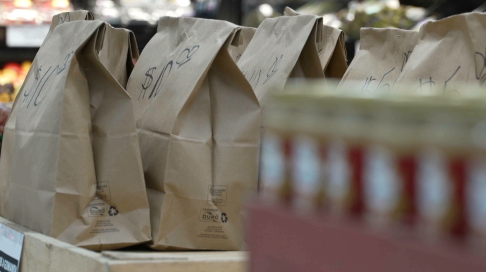 Each brown bag comes pre-packed with pantry staples and eventually ends up at the local food pantry.