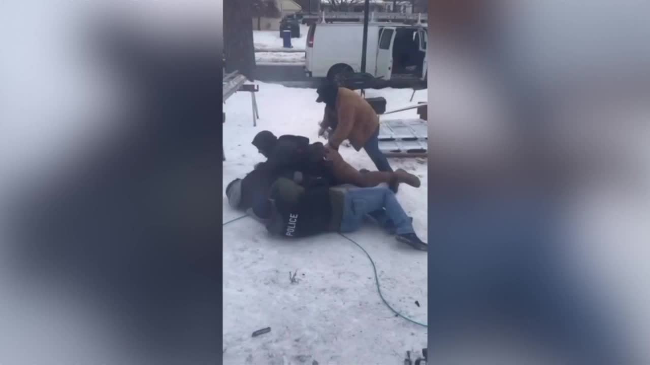 Joi Patterson tells us she walked out of her home to see a handful of law enforcement agents with guns drawn and aimed at the workers on her roof. That's when she pulled out her cell phone to start filming.