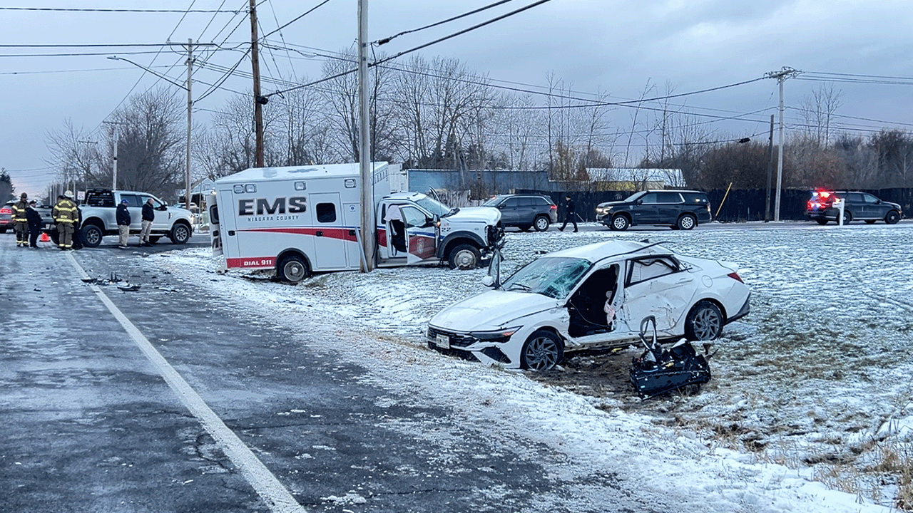 The sheriff's office said the driver of the vehicle that was struck by the ambulance, a 42-year-old man, was airlifted by Mercy Flight to ECMC for treatment of life-threatening injuries. The pedestrian was transported by ambulance to ECMC for treatment of non-life-threatening injuries. The two ambulance crew members were evaluated at the scene and released.