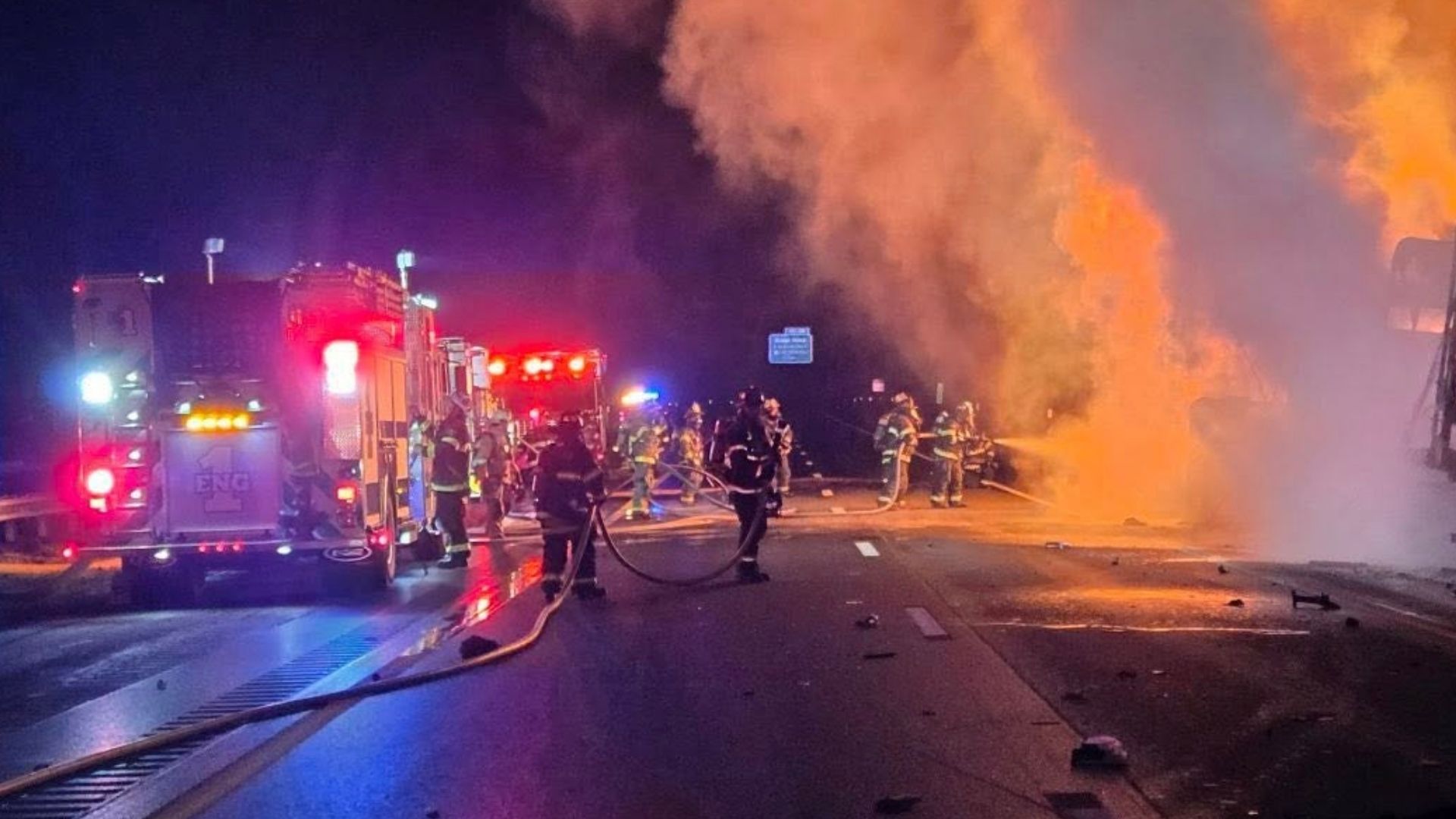 LACKAWANNA, N.Y. (WKBW) — The thruway was closed for several hours early Sunday morning for a fiery crash involving two tractor-trailers.
