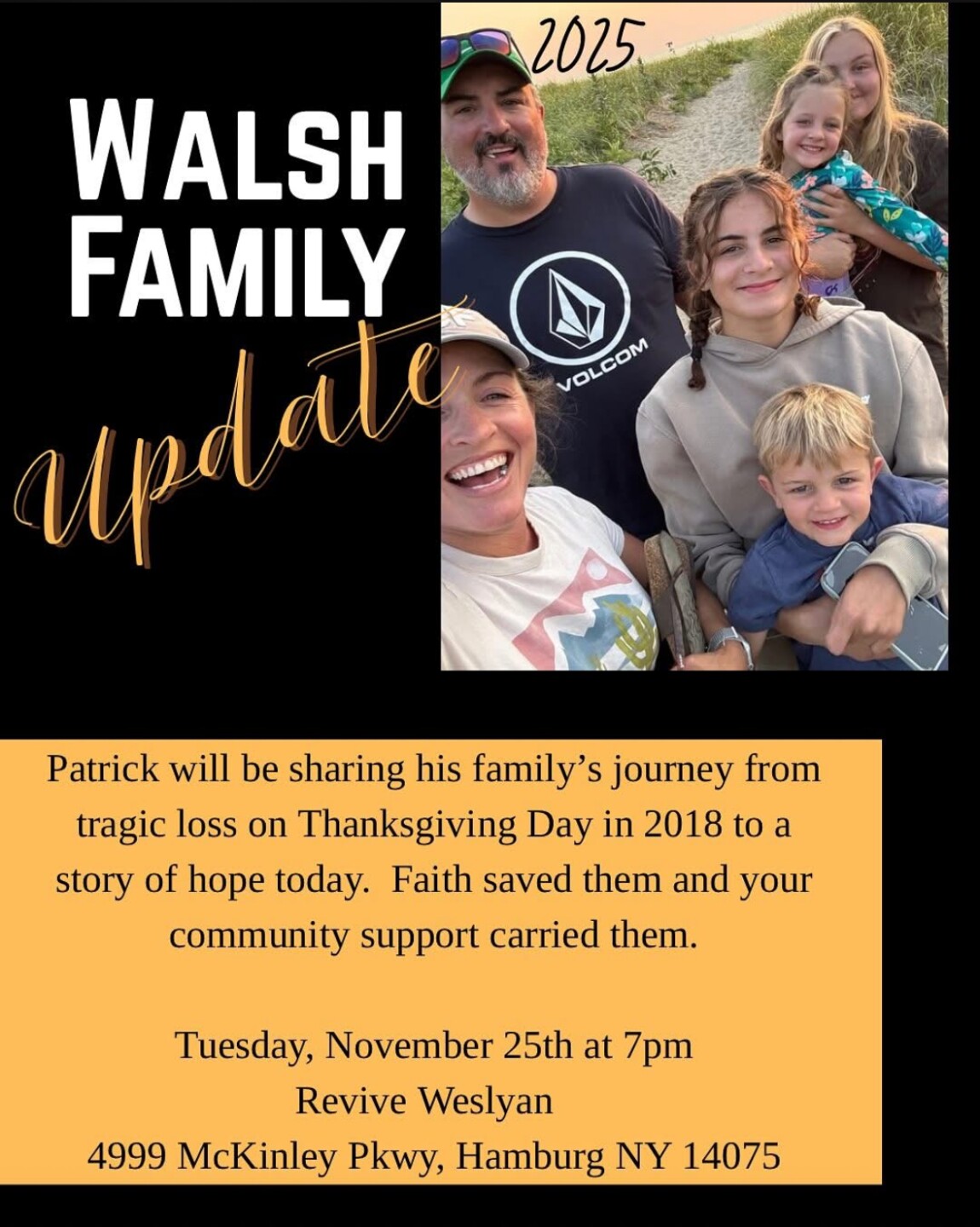 Patrick will share his family's story on Tuesday at 7 p.m. at Revive Wesleyan Church, located at 4999 McKinley Parkway in Hamburg. The event will also be livestreamed on the church's website at https://live.revivewesleyan.com/.