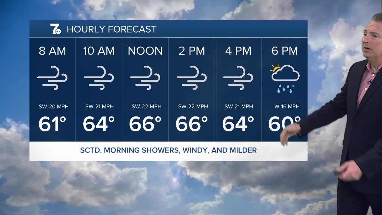 Rain showers will move through the area early this morning. Partly sunny, breezy, and mild this afternoon with a few showers across the Southern Tier.