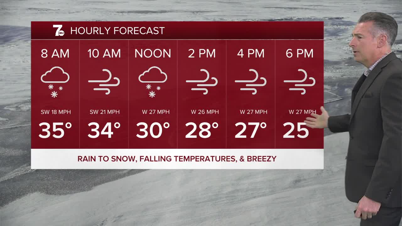 Rain will mix with and change to snow this morning. Temperatures will drop into the 20s later today, and winds will gust 40 to 50 miles per hour. Expect 1 to 3" of snow for Metro Buffalo, and 3 to 6" of snow for areas south of the city.