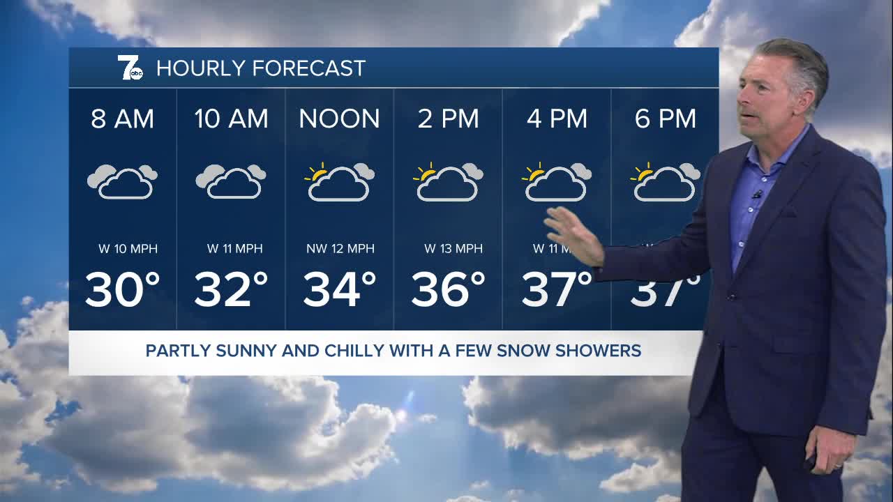 BUFFALO, N.Y. (WKBW) — A chilly day with highs in the upper 30s this afternoon. A few flurries across the area this morning with drier air arriving this afternoon. Partly cloudy and cold tonight with lows near 30. Milder on Tuesday with highs in the mid 50s. High temperatures back in the 60s on Wednesday.