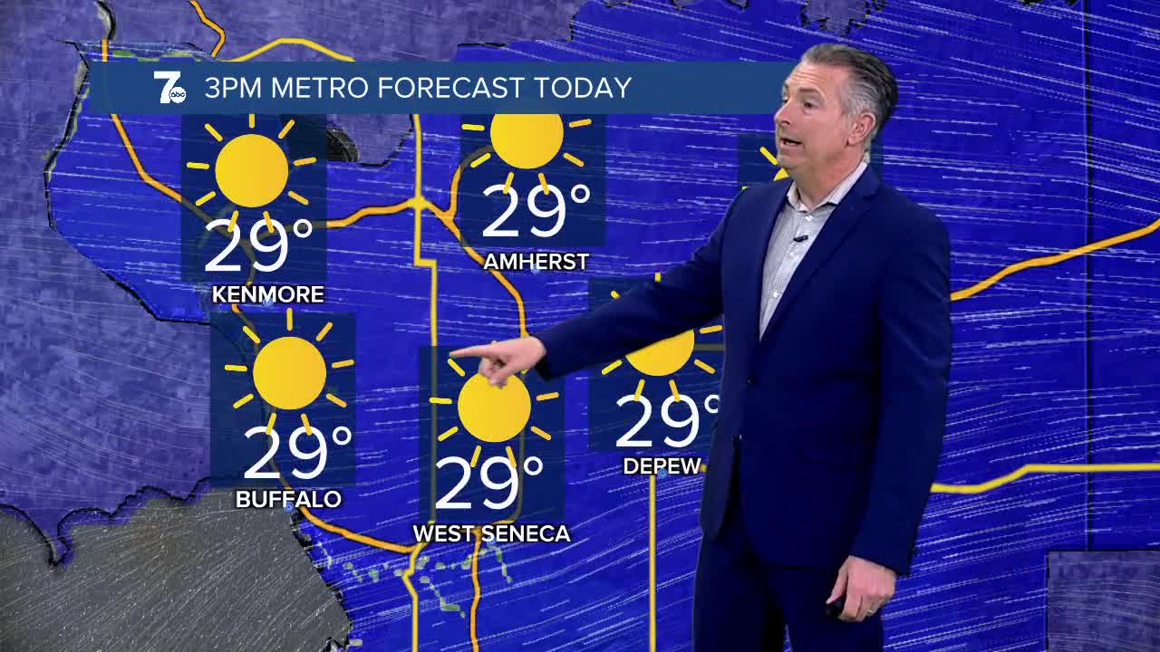 BUFFALO, N.Y. (WKBW) — Mostly sunny and chilly today with highs near 30 degrees. Clouds increase overnight with lows in the low 20s. Rain showers will return on Tuesday with some freezing rain possible across the Southern Tier.