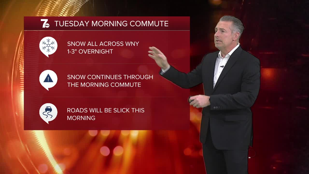Winter Weather Advisory from 1 a.m. Tuesday to 7 p.m. Tuesday for all of Western New York. For Southern Erie, Wyoming, Chautauqua, Cattaraugus, and Allegany Counties, 3 to 6" of snow expected. For Northern Erie, Niagara and Orleans counties, 2 to 4" of snow expected.