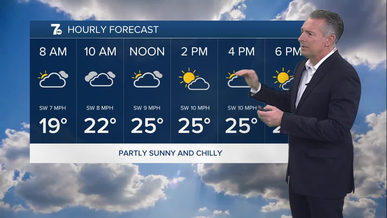 BUFFALO, N.Y. (WKBW) — A few flurries this morning with temperatures near 20 degrees. Dry air arrives providing partly sunny skies this afternoon with highs in the mid to upper 20s. High pressure settles over the area on Friday with highs back in the 40s. More clouds on Saturday with highs near 40; temperatures dropping for Sunday.