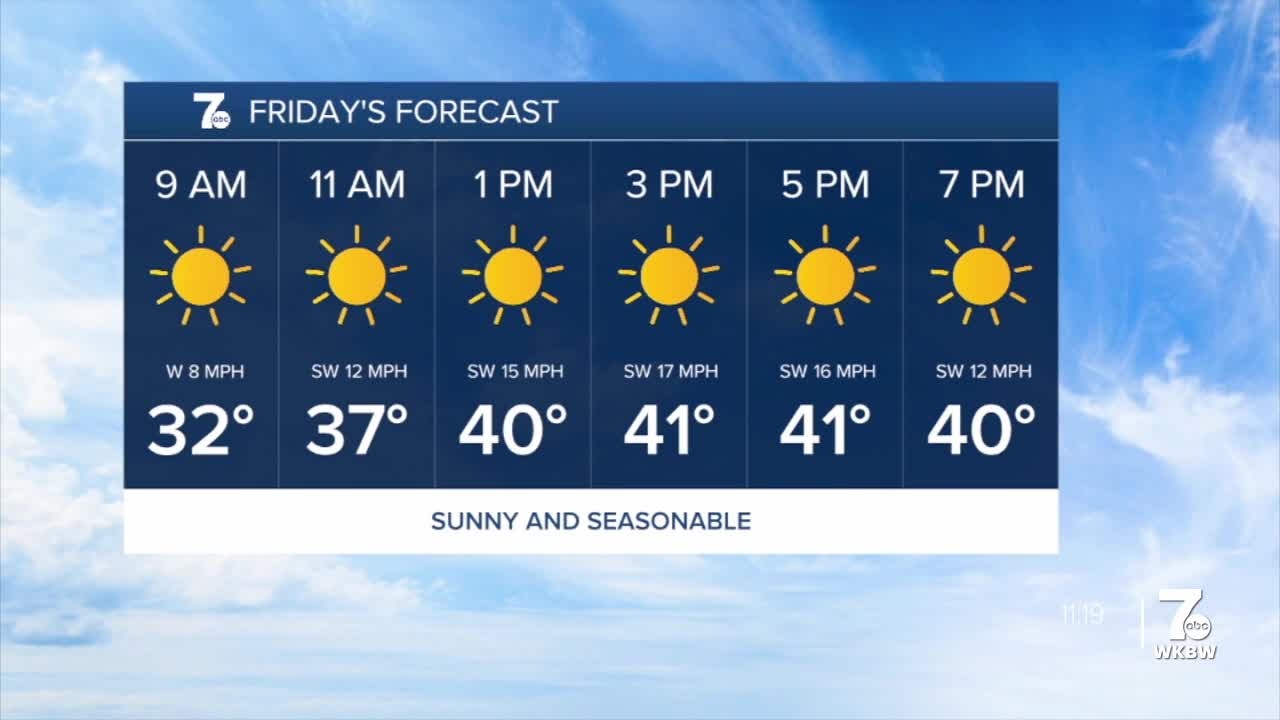 BUFFALO, N.Y. (WKBW) — Temperatures continue to tumble through the night bottoming out in the upper 20s. It'll be breezy with wind chills near 20. Grab your sunglasses with your heavier jacket Friday morning.