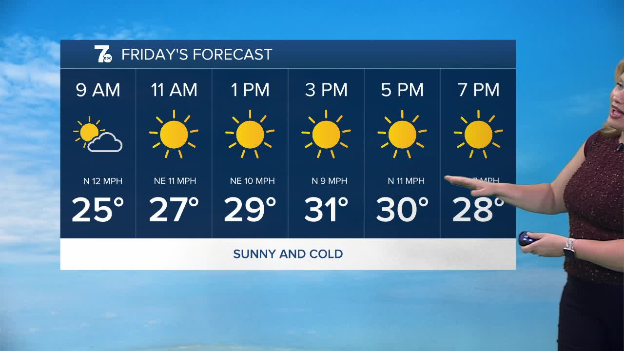 BUFFALO, N.Y. (WKBW) — Rain, heavy at times moves south as temperatures tumble overnight. Any left over precipitation will fall in the form of snow, little to no accumulation expected. Standing water on elevated surfaces may freeze over creating slick spots for Friday morning. Increasing sunshine Friday with frigid temperatures staying near freezing with wind chills in the 20s. Saturday is another chilly day for Easter Egg Hunts across WNY and for the second weekend of Maple Weekend. Temperatures struggle to get into the mid-30s under partly sunny skies and even a few flakes are possible. Sunday is more seasonable in the mid to upper 40s.