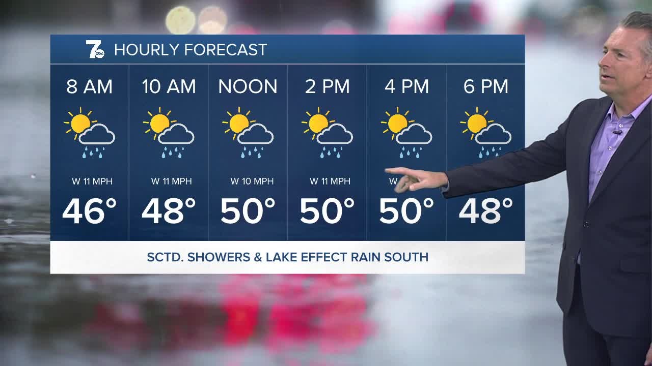 Cool air over Lake Erie will result in lake effect rain showers again today. The steadier showers will be across the Southern Tier. It will stay cool and unsettled through early Saturday.