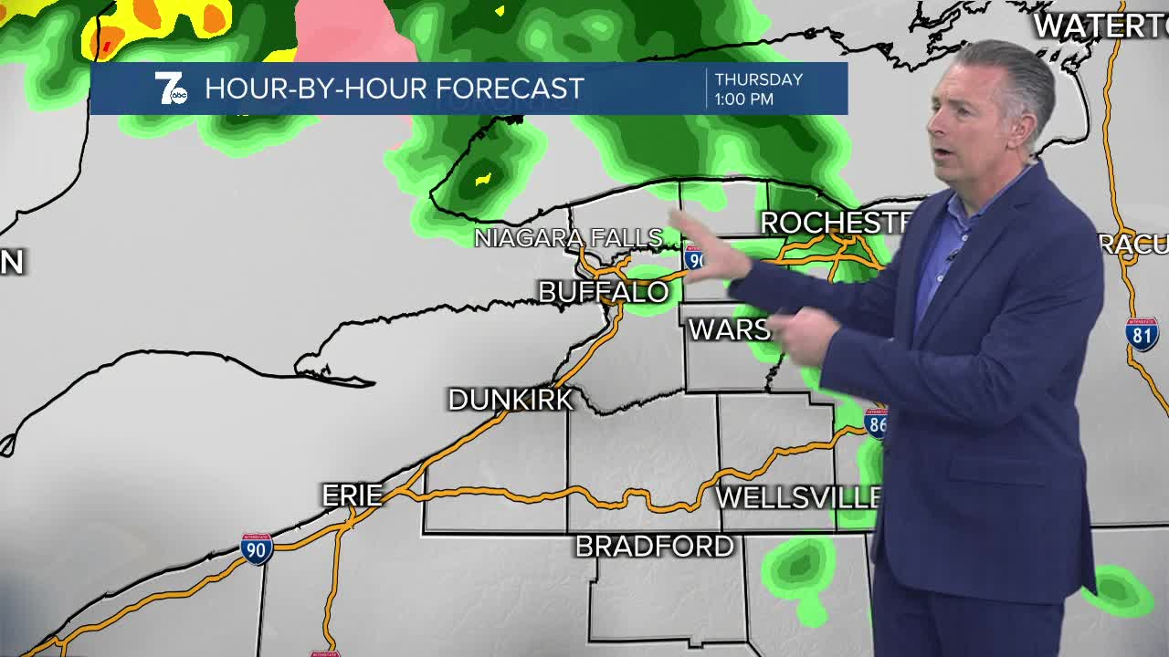 BUFFALO, N.Y. (WKBW) — A warm front will move through the area later today. A few showers will develop as temperatures rise into the 50s. Winds and temperatures will increase overnight. A few showers possible Friday morning. It will be partly sunny and windy Friday afternoon. Showers and storms return on Saturday with highs near 70. Easter Sunday will be much cooler with highs in the mid 40s.