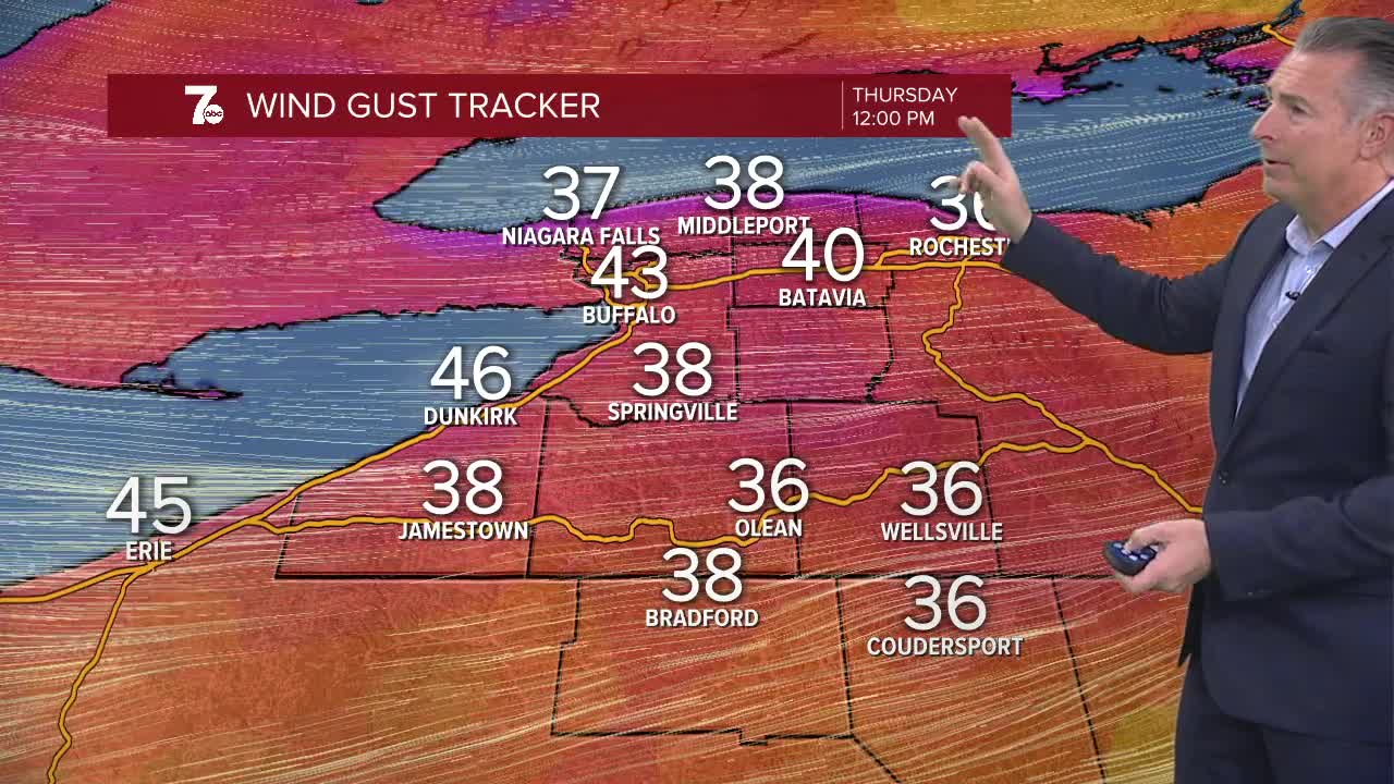 Wind Advisory for Erie, Niagara, Orleans, Genesee, Wyoming, and Chautauqua Counties for winds gusting near 50 miles per hour.
