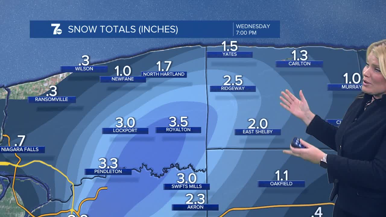 The lake band strengthens overnight and focus on Buffalo. At onset there could be rain mixing in near the lake shore to limit accumulations, then into the overnight it gets cold enough for all snow. And inland, in the most persistent portion of the band which remains snow, you can expect 3-5" of accumulation. Expect snow early Wednesday morning to change to rain as the morning moves along and the band shifts a bit south as temperatures warm up to near 40. The last areas to see the switch to rain will be the hill tops east and south of Buffalo for Wednesday afternoon.