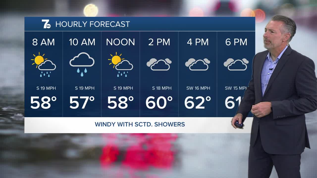 Windy with rain showers this morning. Mostly cloudy this afternoon with highs in the low to mid 60s. Another round of rain arrives on Wednesday with highs in the mid 50s. High temperatures in the upper 40s Thursday through Saturday.