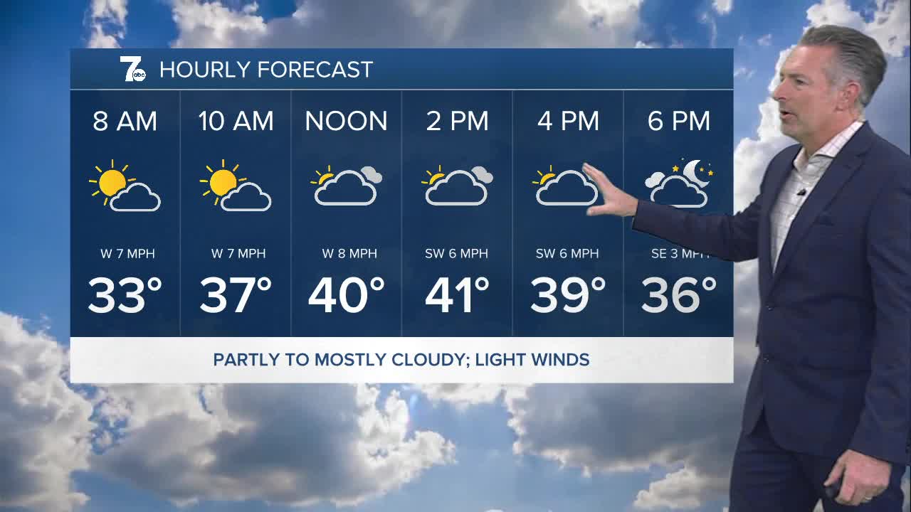 Partly sunny skies today through Thursday with highs in the 40s. Rain will return on Friday with drier air returning for the weekend.