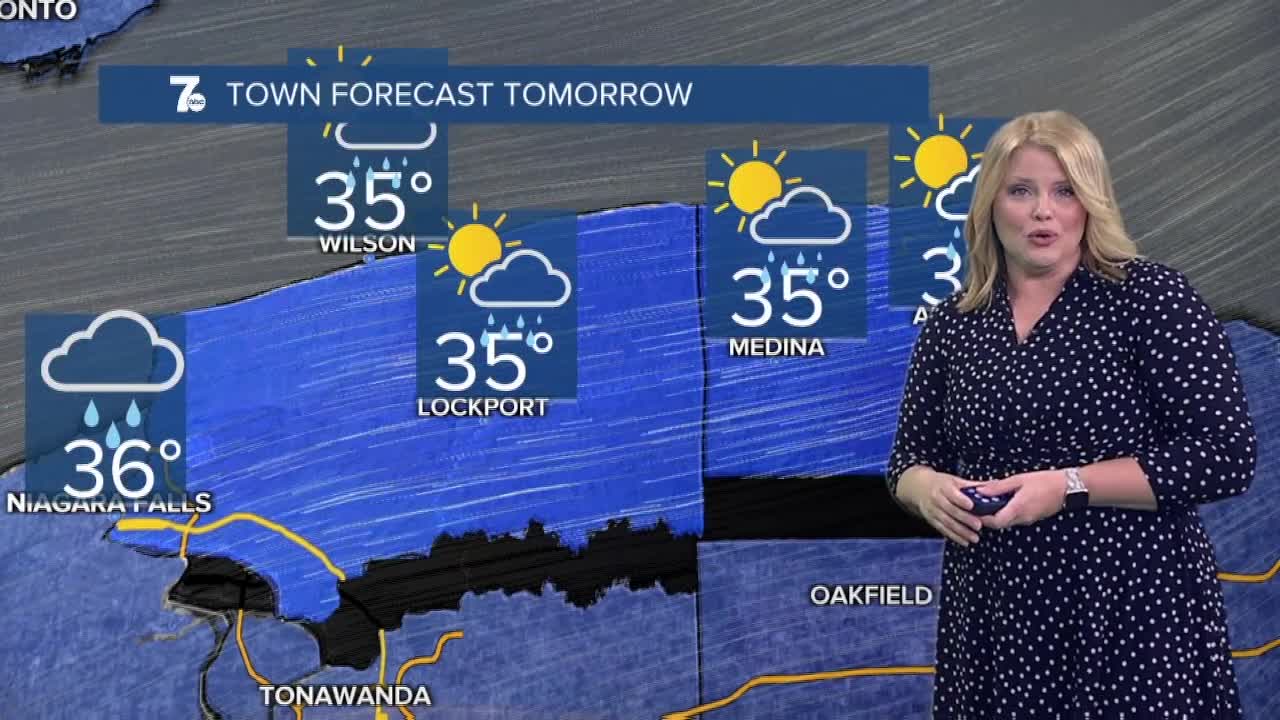 BUFFALO, N.Y. (WKBW) — Turning chilly tonight with lows in the low 30s. More rain is heading our way Thursday with a chance of icy spots north and east Thursday evening. Ice accumulations will be light and likely hug the southern shore of Lake Ontario. Friday temperatures will be in the mid 50s with mostly cloudy skies and areas of fog. Saturday will be warmer with highs in the upper 60s. Rain showers, thundershowers, and strong winds possible Saturday.