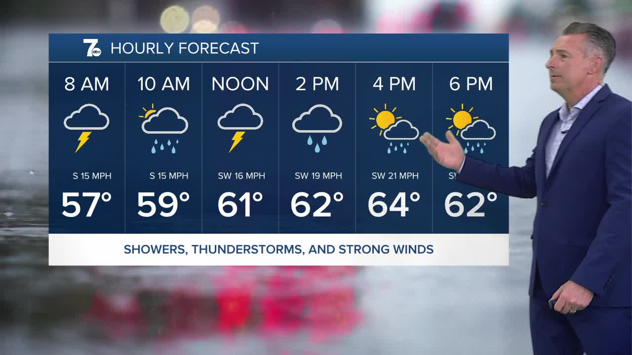 BUFFALO, N.Y. (WKBW) — Showers and thundershowers likely today. Rain will arrive before 7 a.m. in Buffalo. Rain will be heavy at times. Winds will increase with gusts near 45 miles per hour this afternoon. Temperatures this afternoon will be in the 60s. Temperatures tumble on Thursday with highs in the mid 30s. A few flurries will fly Thursday morning.
