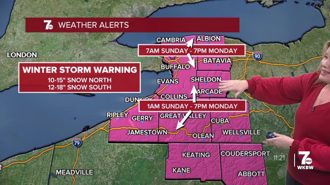 Winter Storm Warning from 7am Sunday to 7pm Monday for Northern Erie, Niagara, Genesee, and Orleans Counties for heavy snow. 8 to 14 inches of snow possible by late Monday.