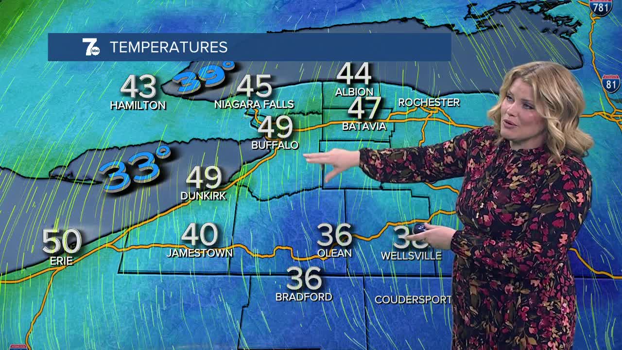 BUFFALO, N.Y. (WKBW) — Turning breezy and warmer Thursday with a chance of spotty late afternoon and early evening showers and highs in the mid 60s. Not as warm on Friday with scattered showers around lunch time and highs near 50F. The weekend looks dry with partly sunny skies both days with highs in the low 50s Saturday and the mid 60s Sunday