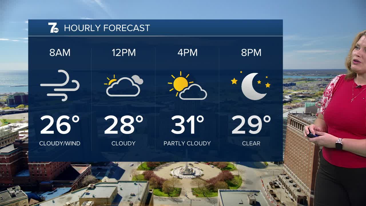 BUFFALO, N.Y. (WKBW) — Morning flakes and frigid conditions. Temperatures get into the low 30s with wind chills in the 20s with a stiff breeze. Increasing sunshine for the afternoon with winds diminishing. It'll be a cold night with clear skies and temperatures near 20. Sunny and seasonable Wednesday with highs in the lower 50s. A shot for a few showers on Thursday with highs in the mid 60s.