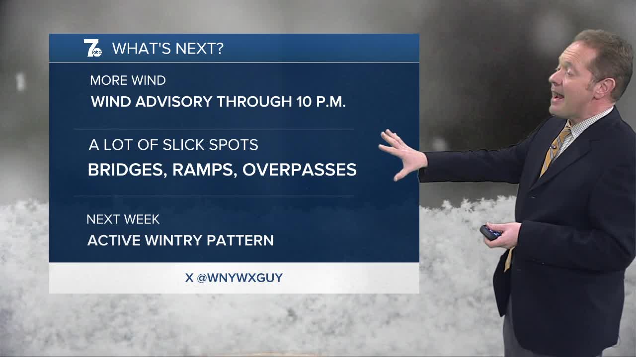 BUFFALO, N.Y. (WKBW) — Winds will gradually decrease heading into this evening after gusting to 56 mph earlier on today. As temperatures tumble, roads and sidewalks will freeze quickly. This is especially true for secondary, untreated, and elevated road surfaces. Be mindful of black ice Monday morning.