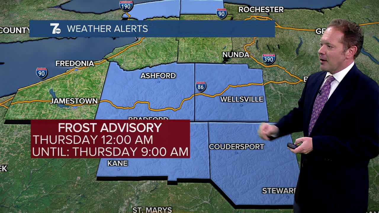 BUFFALO, N.Y. (WKBW) — Right on cue, the start of October today brings some of the most fall like weather of the week. Temperatures won't make it past the mid-60s today but expect just about 100% of the possible brightsunshine again. It'll be a cool night Wednesday night as temperatures fall into the lower 40s and even some mid-30s across inland areas with the threat for patchy frost. Frost advisories go up for Cat. county and Alleghany county tonight. The cooler air is short lived, and temperatures climb back above normal later in the week. WNY could be topping out near 80 for the weekend.