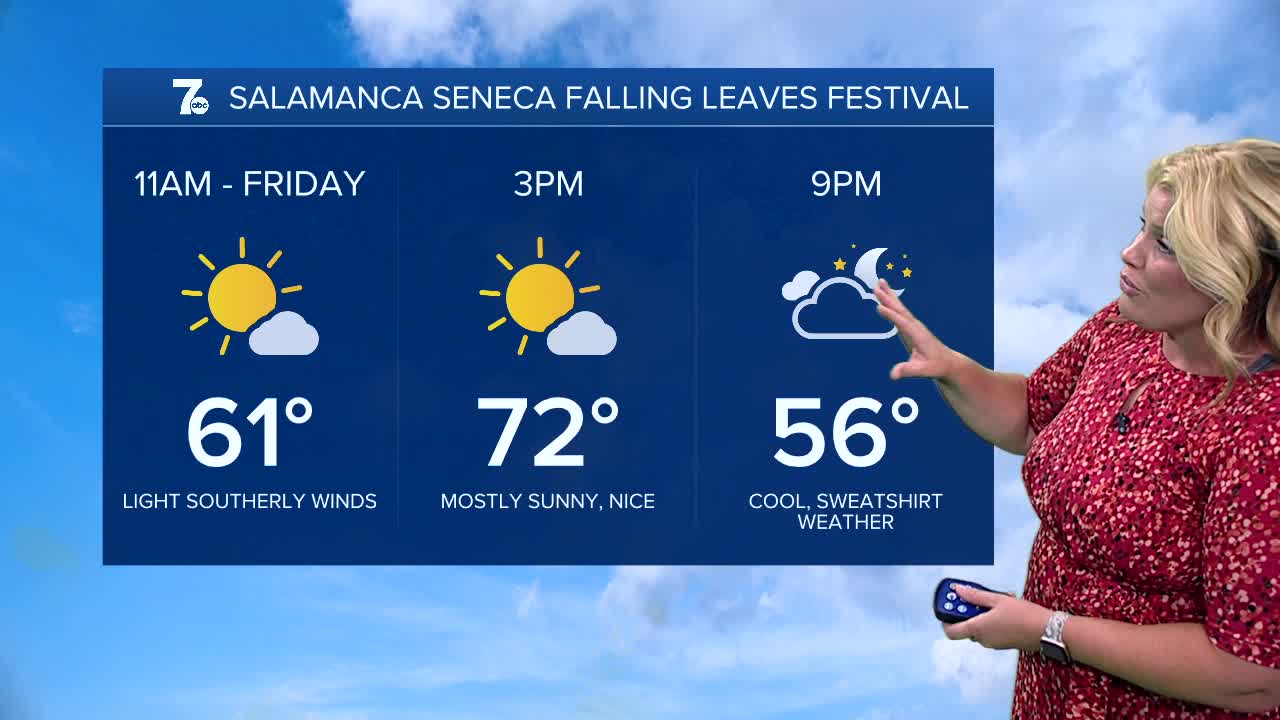 BUFFALO, N.Y. (WKBW) — Cool and comfortable tonight as temperatures settle into the 50s and 40s across the S.Tier. It'll feel more like mid-summer this weekend! As the leaves continue to change and fall from our trees, the mercury will make it feel strange as highs rise about 15 degrees above average into early next week.