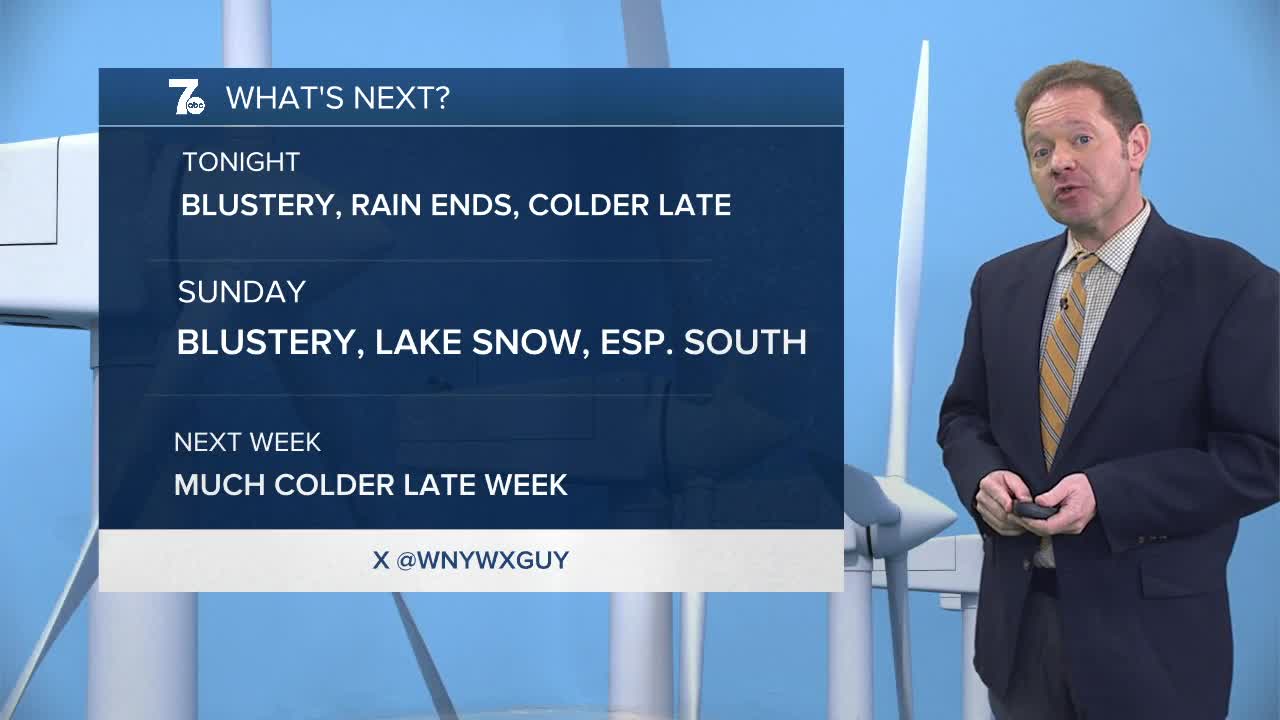We'll head into Sunday with winds on the blustery side, along with temperatures near freezing. Lake flakes will fly especially south of Buffalo. 3 to 6 inches of snow are possible in the most persistent snow bands near Ski Country. The rest of us will see a coating to an inch or two by evening.