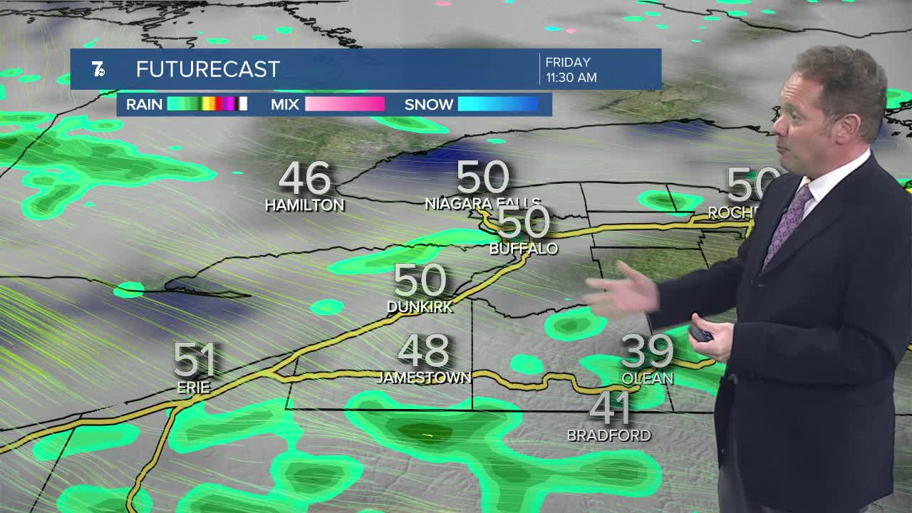 Cool air sweeping across Lake Erie will result in lake effect rain showers this afternoon and evening. The steadier showers will be across the Southern Tier. It will stay cool and unsettled through early Saturday.