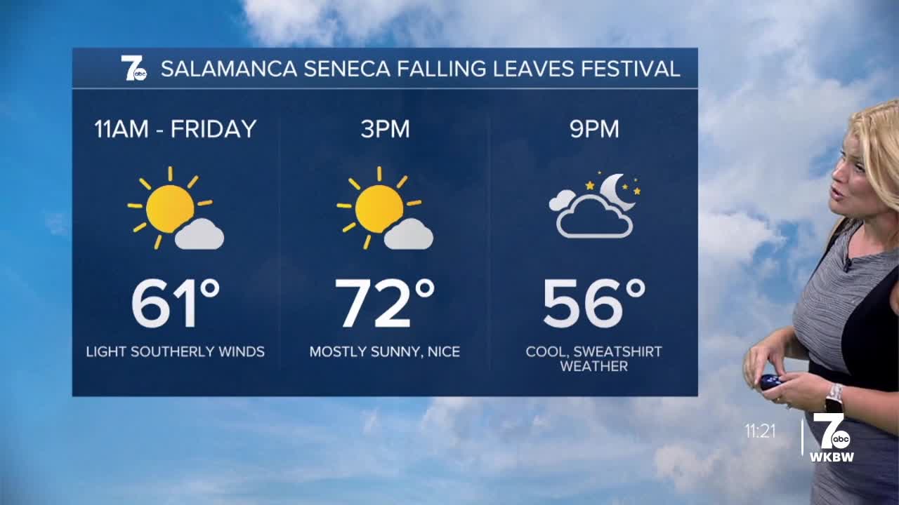 BUFFALO, N.Y. (WKBW) — Clear and cool tonight as temperatures fall into the lower 50s and upper 40s for the S.Tier. The most fall-like day is upon us for Wednesday and how apropos, it's October 1st! Temperatures won't make it past the mid-60s Wednesday afternoon but expect complete sunshine again. It'll be a cool night Wednesday night as temperatures fall into the lower 40s and even some mid-30s across inland areas with the threat for patchy frost. The cooler air is short lived, temperatures climb back above normal later in the week. WNY could be topping out near 80 for the weekend.