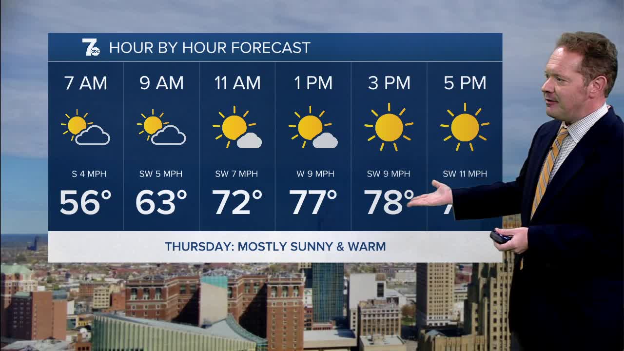 BUFFALO, N.Y. (WKBW) — Today did not bring record warmth, but it did come close, missing the record high by just 3 degrees, with a top temp of 83 degrees! Truly, this is some of the finest weather imaginable for this time of year, with low humidity, good visibility, gentle breezes, comfy cool nights, pleasantly warm days, and no shortage of sunshine. We do desperately need some rain though. Buffalo and the Niagara Frontier, including most of the areas close to Lake Ontario, are all officially still in "moderate drought", according to the Palmer Drought Severity Index. A cold front will approach on Thursday, and MAY trigger a brief shower by evening, in time for the Bills game, but we're just talking about maybe a sprinkle. The front will do more to knock the temperature down than trigger a shower with highs into the 60s for Friday! Warmth returns by the end of the weekend.