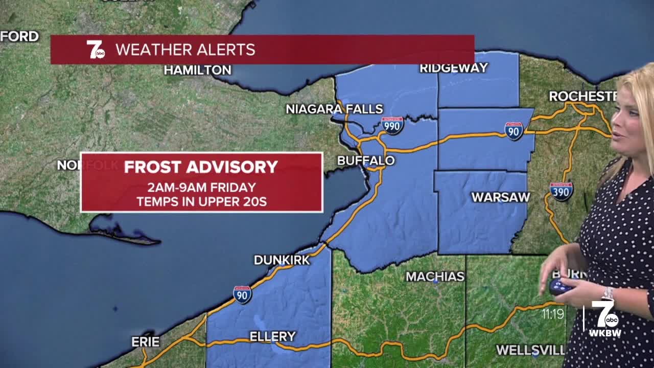 Frost Advisory for Niagara, Orleans, Genesee, Erie, Wyoming and Chautauqua county from 2am-9am Friday. Temperatures fall into the upper 20s. Protect sensitive vegetation.