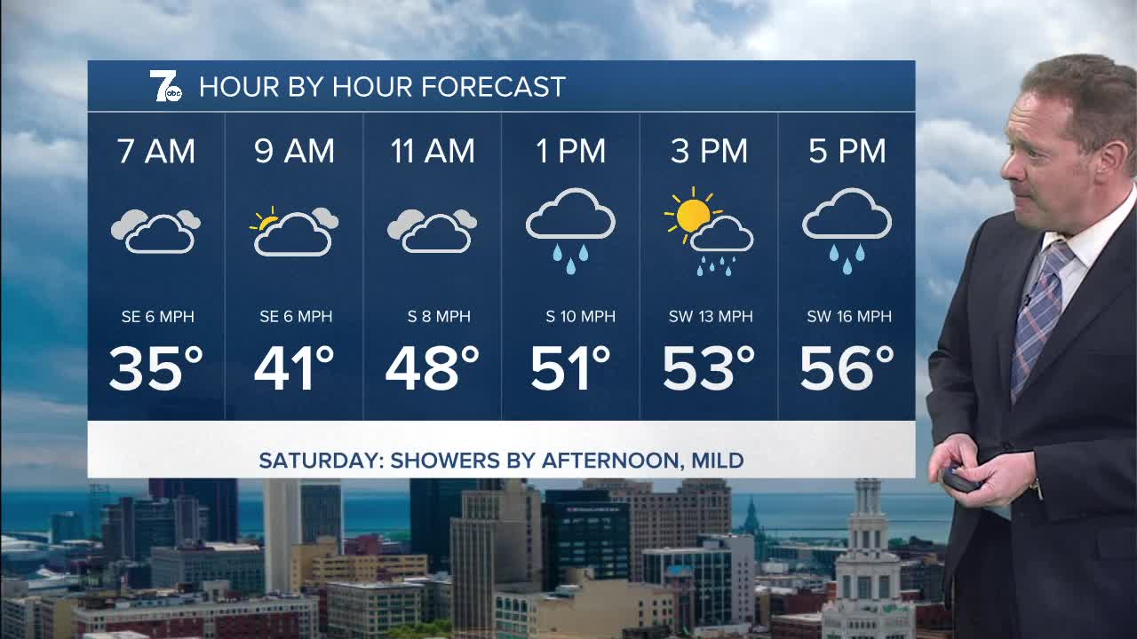 A warm front moves in Saturday; rain arrives in the afternoon and temperatures rise into the 50s. Expect steady — at times heavy — rain into the evening with a few rumbles of thunder possible, so plan accordingly for Saturday afternoon and evening. The rain changes to snow Sunday as temperatures fall back into the 30s. Strong, gusty northwesterly winds will produce chilly wind chills and lake-effect snow — mainly south of Buffalo, though some bands could clip areas north as well.