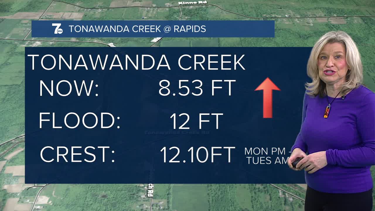 FLOOD WARNING for Tonawanda Creek at Rapids from Monday evening through Tuesday morning. Minor flooding is anticipated. The river is expected to rise above flood stage Monday afternoon or evening to a crest of 12.1 feet Monday evening. It will then fall below flood stage early Tuesday morning. At 12.0 feet, Flood stage, lowland flooding of farm areas along Tonawanda Creek between Rapids and the Tonawanda Indian Reservation. Flooding may impact Fletcher, Burdick, Kelkenberg, and Tonawanda Creek Roads.