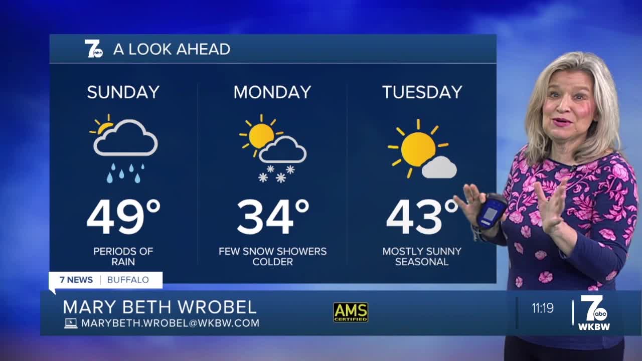 BUFFALO, N.Y. (WKBW) — Clouds will increase and thicken Saturday night with temperatures steady or rising through the upper 30s and low 40s. Rain chances pick up as we head into Sunday and will be steady with heavy downpours at times. Expect highs in the upper 40s. Sharply colder on Monday with a few snow showers and highs in the low to mid 30s30s. Sunshine returns Tuesday with top temps in the low 40s.