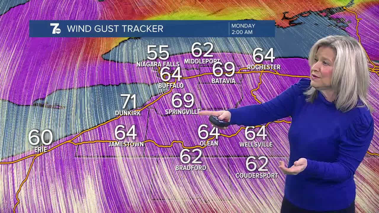Wind ADVISORY for Northern Erie, Niagara, Orleans, Genesee, Wyoming, Allegany, Cattaraugus counties until 8pm Monday and for McKean, Potter counties until 11am Monday for southerly wind gusts to 50mph+ Power outages are possible.